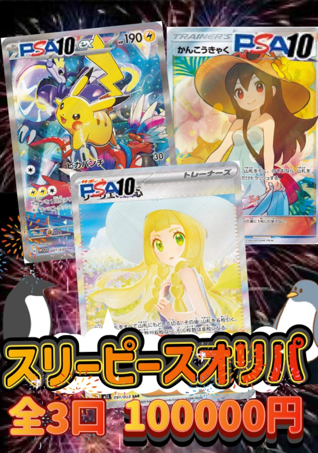 ❤️スリーピースオリパ❤️ ☆一口 100000円(税込) ☆送料一律600円(梱包材含め) ⭐︎全3口 豪華当たり一覧 《大当たり》 PSA10 リーリエの決心 SARとピカチュウ PSA10 かんこうきゃく SR 是非手に取ってみてくださいね♪ 丁寧かつ迅速な対応を心掛けています。 カードが傷つかないように梱包して発送させていただきます。 【お願いと注意事項】 下記に記載している事を御理解、御了承の上、 購入頂ける方のみ、ご購入お願いいたします。 ※比較的状態の良い物を使用しておりますが、 中古であることをご了承の上、購入お願い致します。 ※シャッフルの上購入口数分選択するため カードに偏りがある場合がございます。 必ずお目当てのカードを引けるというわけでは ございませんので、ご理解・ご了承の上 購入お願い致します。 ※カードの価値は全て、当店の基準にて判断し、一律当商品の販売価格と同等とさせていただきます。当商品をご購入頂いた方は、注意事項を全て確認し 内容に同意頂いたと判断させていただきます。 ※カードの内容での評価はご遠慮下さい。 ※レギュレーション外のカードが入ってる場合がございます。予めご了承ください。 ※発送後の事故は保証できませんので、ご了承ください。 ※総当たり口数2口ハズレ1口 ※キャンセルはお受け出来ないこともあります。 ※引換券や割引券も含まれます。 ※入金確認後1日〜5日以内に発送致します。